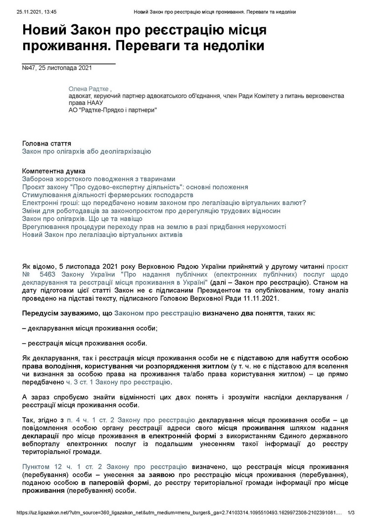 Як відомо, 5 листопада 2021 року Верховною Радою України прийнятий у другому читанні проект № 5463 Закону України «Про реалізацію публічних електронних послуг з реєстрації та декларування місця проживання в Україні» (далі – Закон про реєстрацію). Станом на дату підготовки цієї статті Закон не є підписаним Президентом та опублікованим, тому аналіз проводиться на підставі тексту, підписаного Головою Верховної Ради 11.11.2021 р.