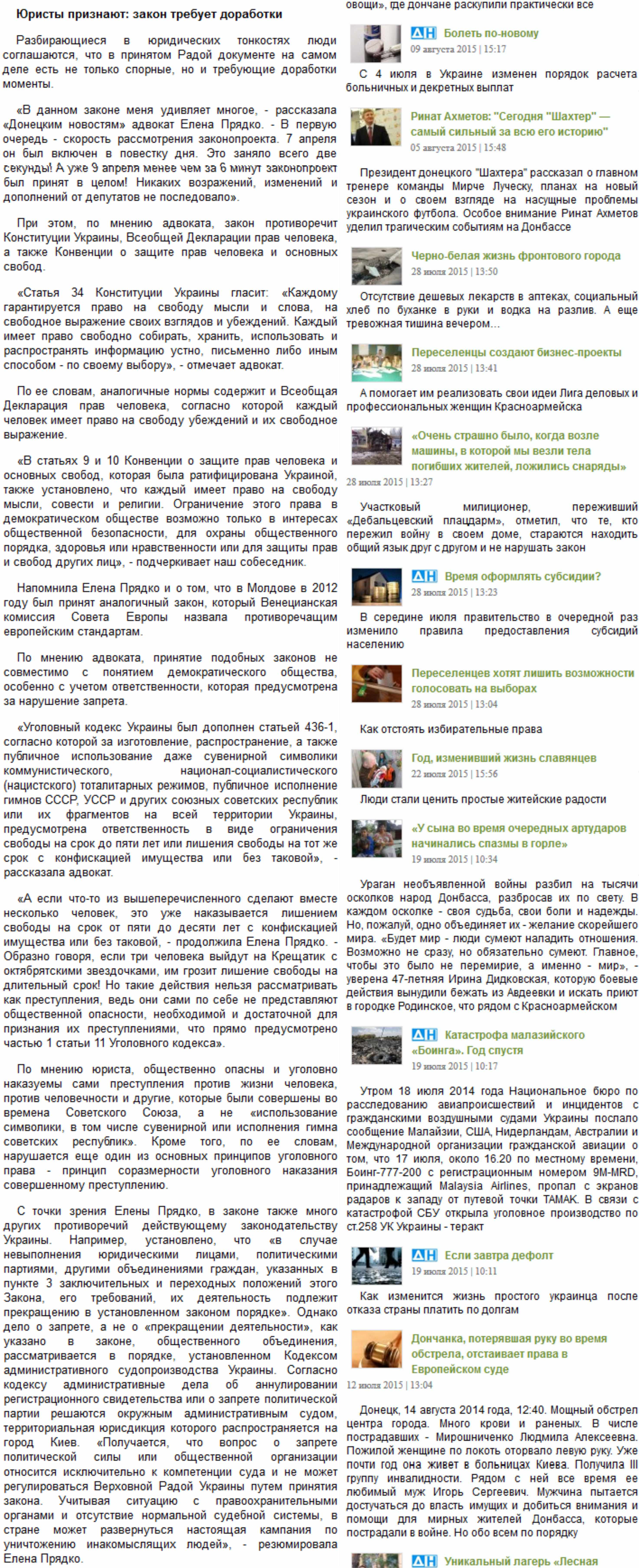 С точки зрения Елены Прядко, в законе также много других противоречий действующему законодательству Украины. Например - установлено, что «в случае невыполнения юридическими лицами, политическими партиями, другими объединениями граждан, указанных в пункте 3 заключительных и переходных положений этого Закона, его требований, их деятельность подлежит прекращению в установленном законом порядке». Однако дело о запрете, а не о «прекращении деятельности», как указано в законе, общественного объединения рассматривается в порядке, установленном Кодексом административного судопроизводства Украины. Согласно кодексу, административные дела об аннулировании регистрационного свидетельства или о запрете политической партии решаются окружным административным судом, территориальная юрисдикция которого распространяется на город Киев. «Получается, что вопрос о запрете политической силы или общественной организации относится исключительно к компетенции суда и не может регулироваться Верховной Радой Украины путем принятия закона. Учитывая ситуацию с правоохранительными органами и отсутствие нормальной судебной системы, в стране может развернуться настоящая компания по уничтожению инакомыслящих людей», - резюмировала Елена Прядко.